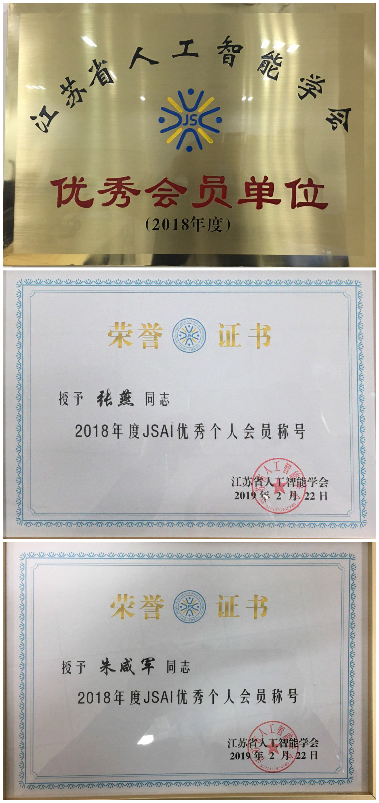 江苏省人工智能学会在《关于2018年度先进集体和个人的决定(苏智会【2018】9号)》中决定授予金陵科技学院为江苏省人工智能学会优秀会员单位(2018年度),授予张燕副校长和朱咸军博士为2018年度JSAI优秀个人会员称号,并授予2017级陈亭谕同学和郭孝斌同学为2018年度JSAI优秀志愿者称号。