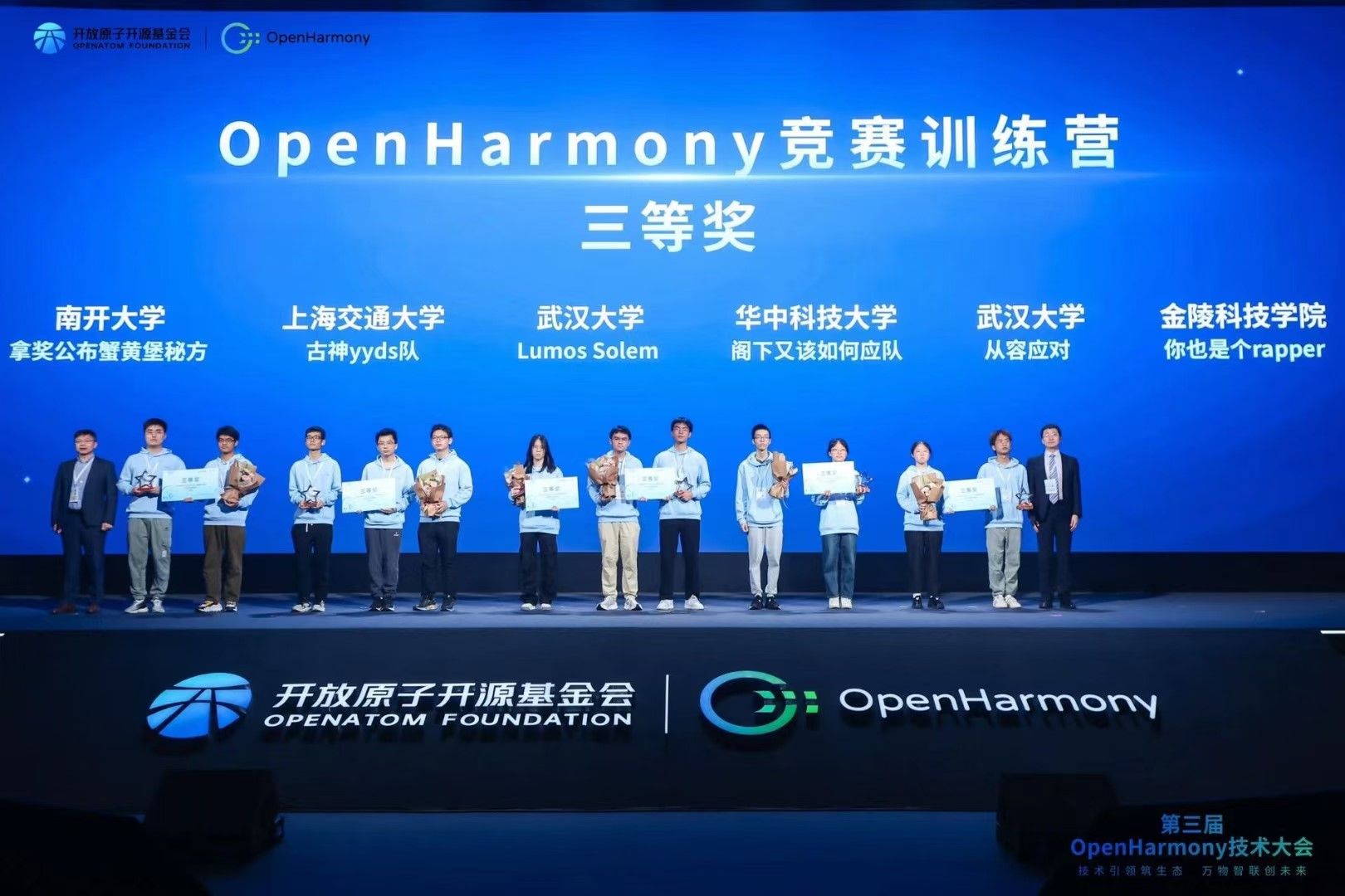 会上,曾岳院长代表金陵科技学院OpenHarmony开发者协会,登上主席台,参加了首批30家OpenHarmony开发者协会盛大启幕仪式。2024年度OpenHarmony竞赛训练营,我校OpenHarmony开发者协会成员刘张豪、徐晨璐同学,与来自上海交通大学、武汉大学、南开大学、华中科技大学等高校的参赛团队在技术挑战难题赛道同场竞技,并获得三等奖,可喜可贺。