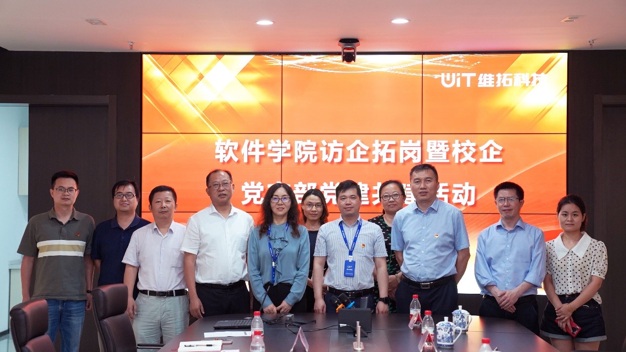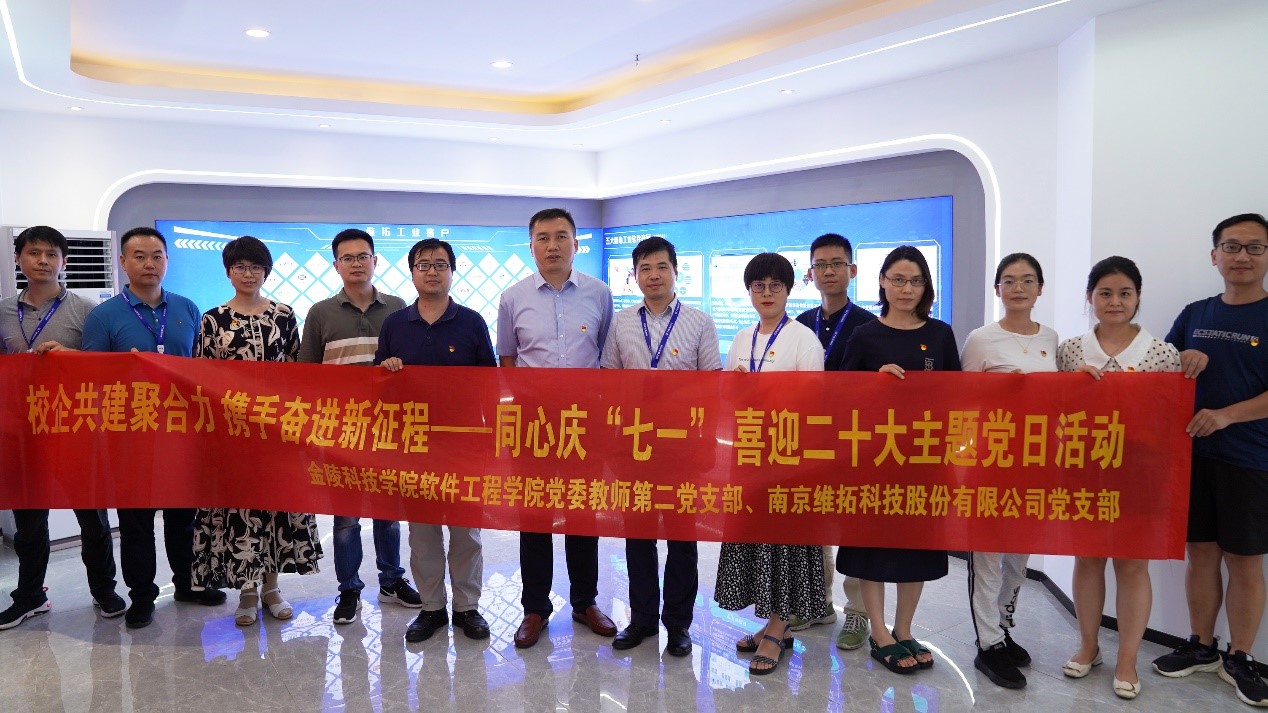 6月30日下午,yd12399云顶集团与南京维拓科技有限公司举行“访企拓岗”暨“校企共建聚合力 携手奋进新征程——同心庆‘七一’喜迎二十大”主题党日活动。软件学院党委书记徐志国、院长曾岳、党委副书记徐斌、副院长胡勇以及学院党员教师代表,南京维拓科技有限公司董事陈金华、副总经理、党支部书记丁亮以及企业党员代表参加本次活动。