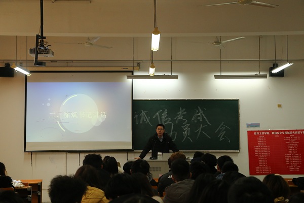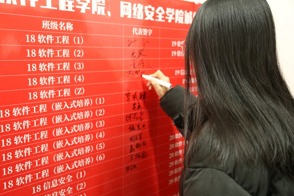 学习部首先进行了学风工作介绍,重点强调班级风气、宿舍风气和诚信之风在学风建设工作中的重要地位。其次,全体代表庄重宣誓并在诚信考试签字板上签字,众人立志以诚信考试为荣,以违纪作弊为耻。最后,徐斌副书记对我院大学生的诚信与担当提出重要要求,再次普及了违规作弊行为的严重后果,并引导大家做好规划,积极迎接考试。