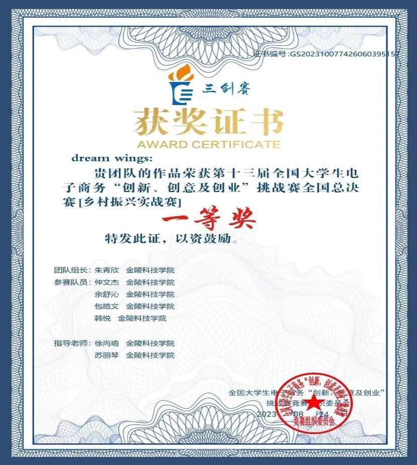 2023年3月,dream wings团队参加校内选拔赛,成功晋级路演答辩环节,最终获得“校赛一等奖”和“最佳创业奖”。6月,dream wings团队代表我校在南京邮电大学参加江苏省省赛,成功斩获省赛一等奖。之后,dream wings团队不断打磨PPT与演讲稿,最终在7月dream wings团队代表学校参加全国总决赛,荣获全国一等奖。