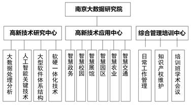2018年4月,金陵科技学院与江宁高新区签订合作协议,共建南京大数据研究院。以高新技术应用为建设核心,以国家级重点研究计划为科研载体,以政、产、学、研、用为发展思路,目标是三年内在现代服务业智慧化创新领域取得业界领先水平,突破高端技术、形成具有市场竞争力的产品成果,力争获取国家级科技奖。研究院实施双委会领导下的院长负责制,加强研究院内部管理,建立高效能的科研攻坚及产品研发团队。
