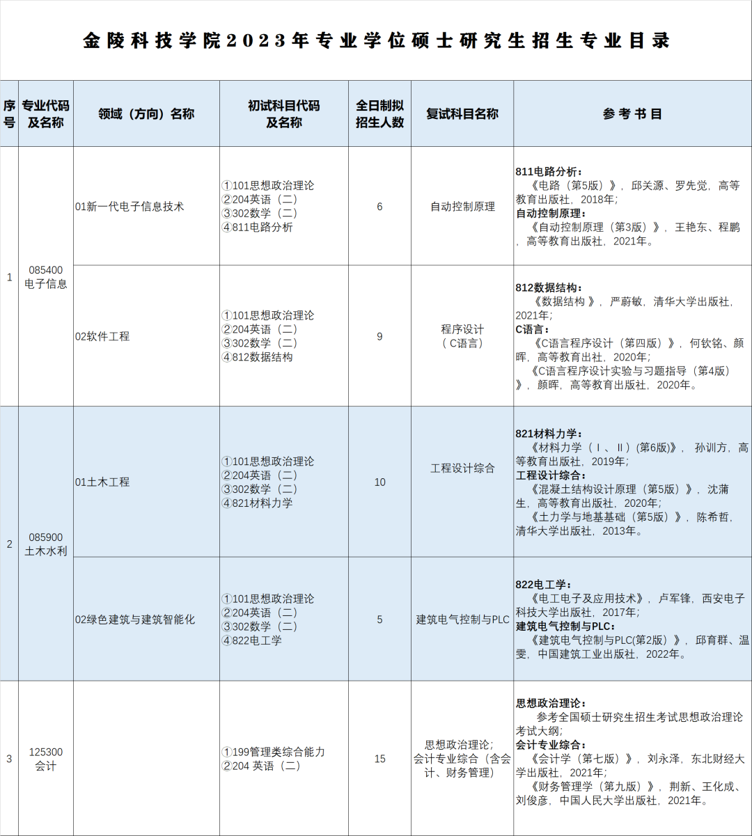 2.初试科目:详见《金陵科技学院2023年专业学位硕士研究生招生专业目录》。